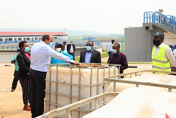 Kigali 24 February 2021- Minister of Infrastructure, Hon. Claver Gatete accompanied by the Chief Executive Officer and the Deputy Executive Officer of Water and Sanitation Corporation (WASAC) visited Kigali Bulk Water Project, made of Kanzenze Water Treatment Plant and its Forwarding Infrastructure, to witness the start of operation for Kanzenze Water Treatment Plant.