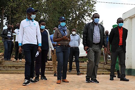 Nyanza, 8 May 2021- Minister of Infrastructure Hon. Claver Gatete accompanied by the Governor of Southern Province, Hon. Alice Kayitesi and other from Ruhango and Muhanga Districts, visited rehabilitation works for Shogwe-Mayaga coordinated development of water storage infrastructure (composed of dam, dyke) and irrigation channels and restoration of wetlands to meet water security demands for water supply. They also visited Shyogwe–Mayaga water treatment plant that supplies 2,400 cubic meters per day in Kamonyi, Muhanga, Ruhango and Nyanza Districts in Southern Province.